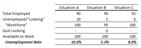 Situation B. Same 100 people as Situation A. However, after several months, 5 out of the 10 people unemployed cannot find work, become frustrated and quit looking for a job. What happens to the unemployment rate? It goes down. Yes, down, even though the total number of people stays the same.